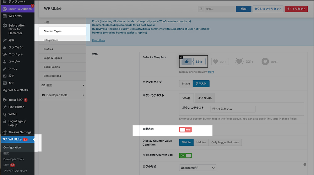 プラグインの設定画面で 自動表示をOFFにする